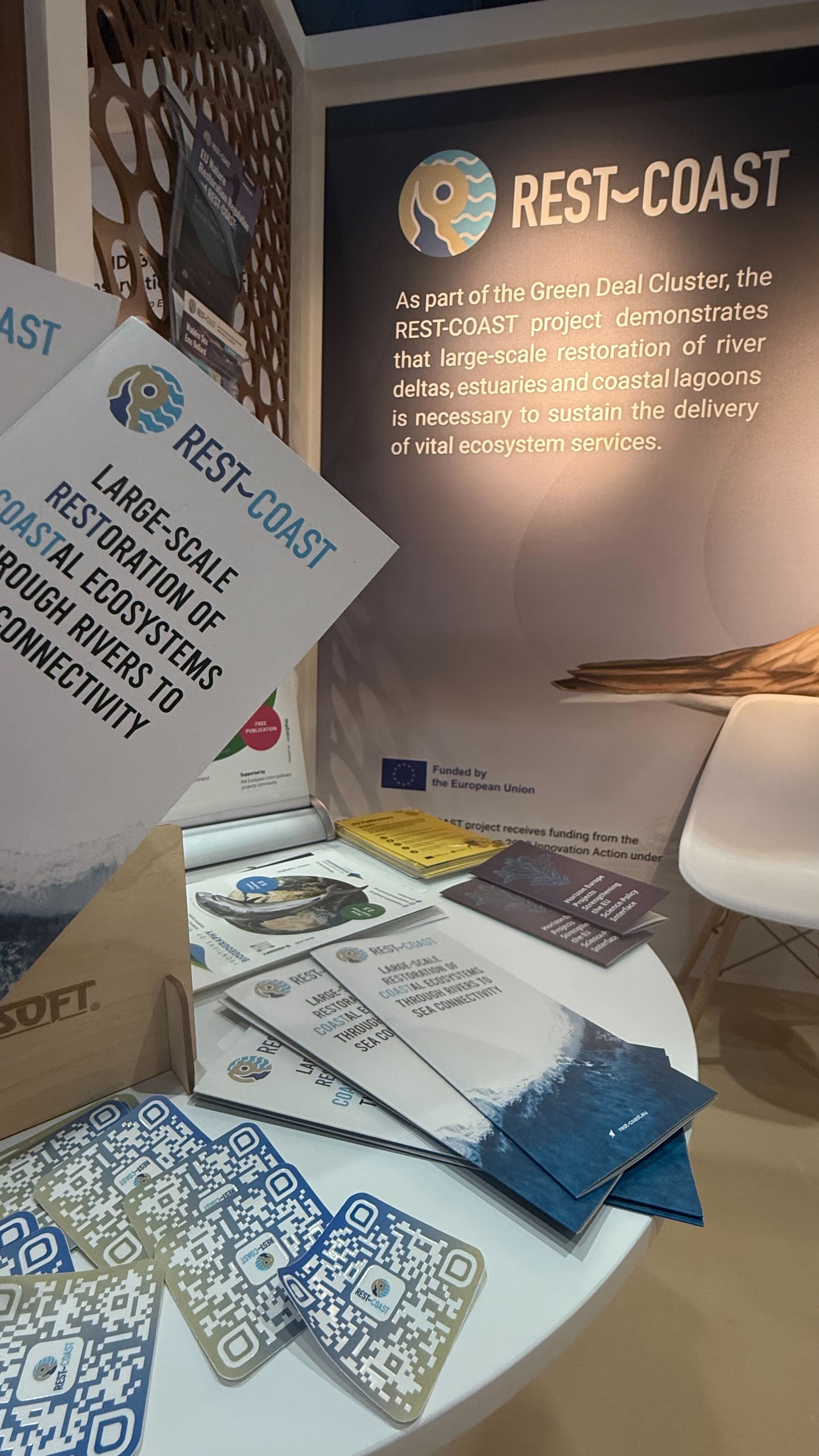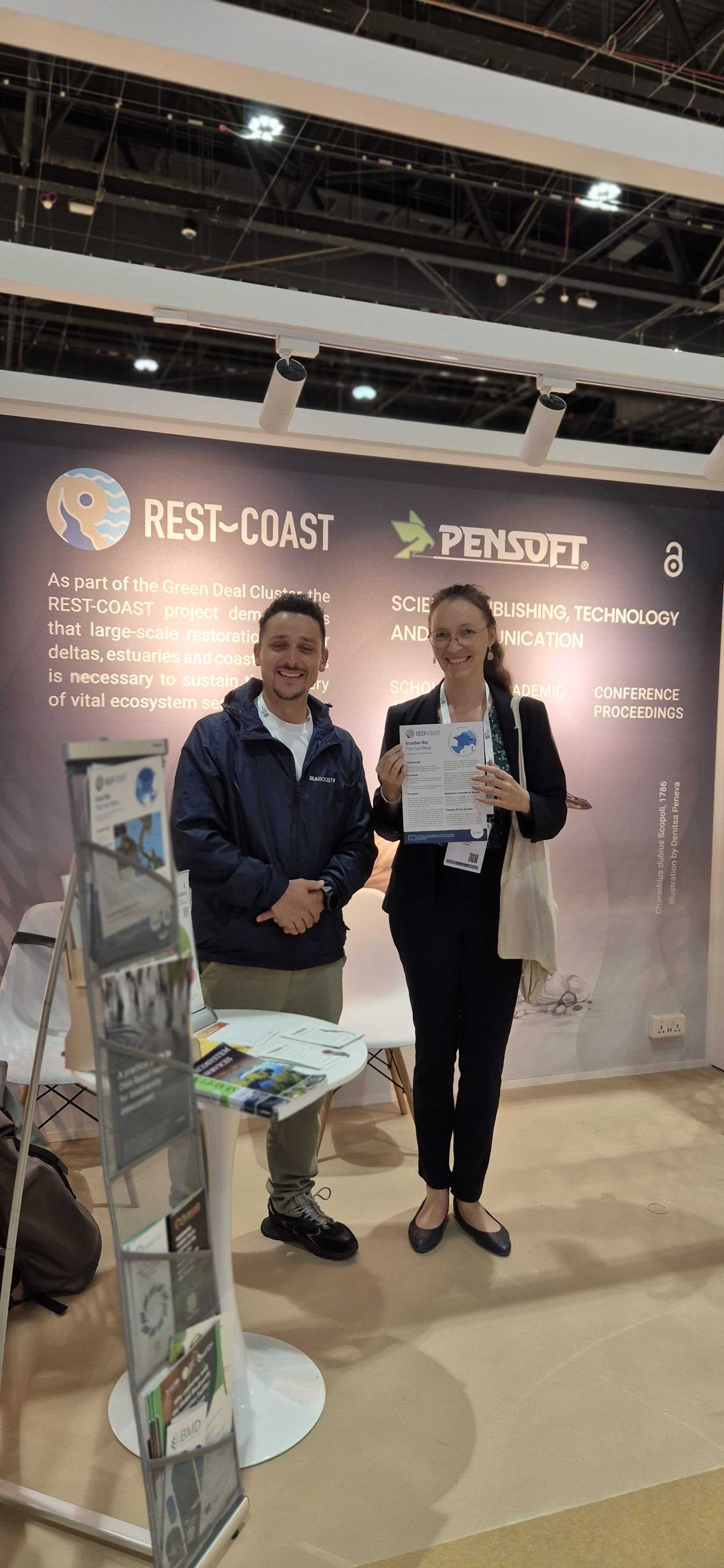 Moreover, the project was showcased at the exhibition booth of the REST-COAST communication and dissemination partner Pensoft Publishers. Along with other Horizon Europe projects, REST-COAST has been highlighted through its information collateral, including pilot site factsheets, policy briefs, brochures and video materials. Participants at the congress, amongst whom were project partners from CMCC and Seaboost, were spotted at the booth chatting with the Pensoft representatives and exploring project materials.